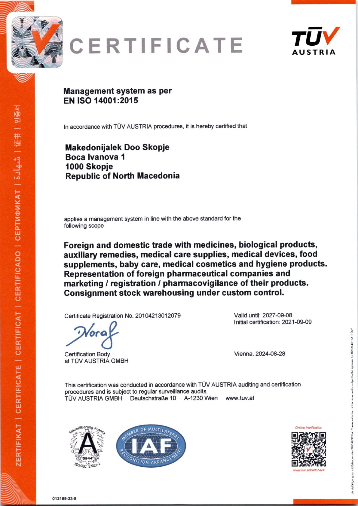 "Makedonijalek" applies a management system in accordance with the standards listed below for the following scope: